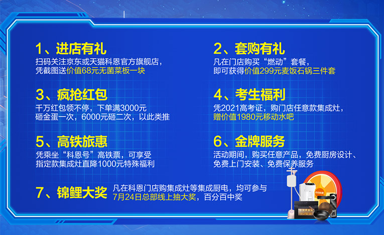 本次集成灶十大品牌、廚電行業(yè)十大品牌科恩集成灶“燃動七月”活動帶來了D115、D109消毒柜款集成灶、D123X、D151X高端蒸烤消一體變頻大吸力集成灶,以七大特權進店禮、套購禮、瘋搶紅包、考生福利、高鐵福利、金牌服務以及錦鯉大獎嗨動全城。更值得一提的是,科恩“燃動七月”活動將在7月24日舉辦線上抽錦鯉活動,買廚電選科恩,活動期間購買科恩集成灶就能抽取錦鯉大獎,百分百中獎,蒸/烤箱、移動水吧、高端指紋鎖、品牌掛燙機等等超值禮品等你拿!