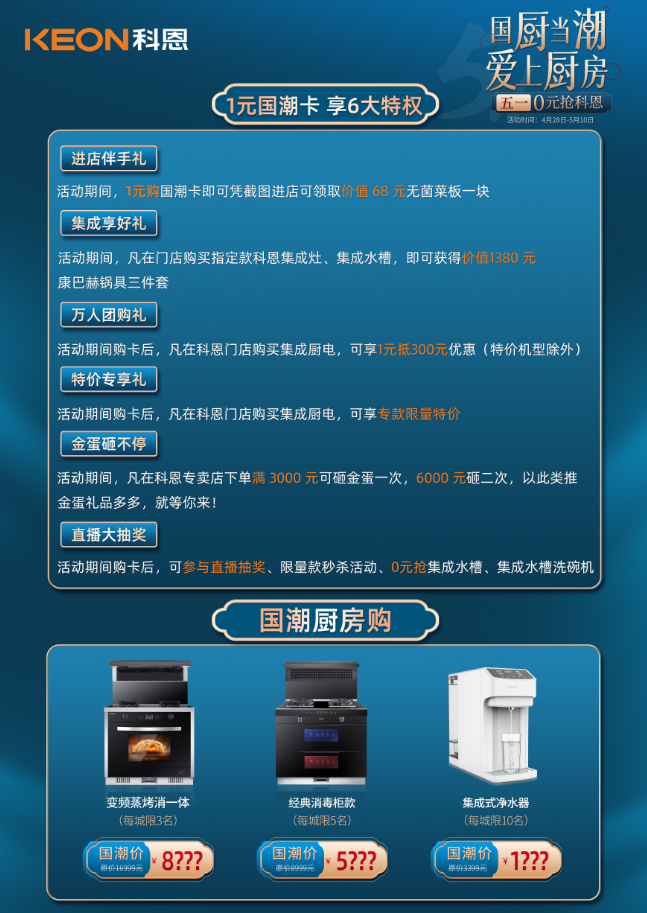 凡是購買1元國潮卡的用戶即可參與直播大抽獎活動:無菌菜板、PP棉濾芯、便攜榨汁杯、凈水龍頭、章丘鐵鍋、康巴赫鍋具三件套、集成水槽、集成水槽洗碗機...海量壕禮發(fā)不停!??!活動精彩紛呈,直播間也熱鬧非凡,全國各地的朋友們積極參與,用指尖傳遞著國廚當(dāng)潮,愛上廚房的精致廚房新理念。