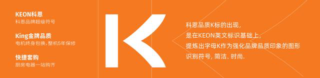 并在KEON英文標(biāo)識(shí)基礎(chǔ)上,提煉品牌超級(jí)符號(hào)“K”,作為強(qiáng)化品牌品質(zhì)印象的識(shí)別符號(hào),也是King金牌品牌(電機(jī)終身包換,整機(jī)5年保修),更是快捷套購(gòu)(廚房電器一站購(gòu)齊)。