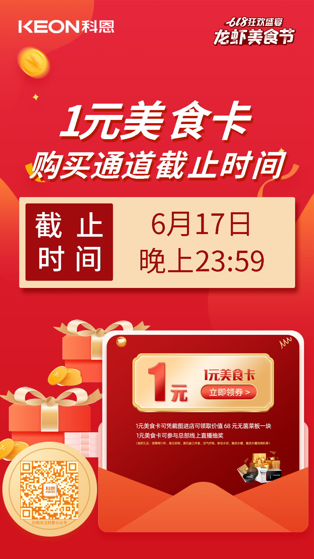 注意!注意!注意!科恩集成灶618狂歡盛宴——龍蝦美食節(jié)將于6月18日14點直播大抽獎后落下帷幕,1元美食特權(quán)專屬卡權(quán)購買通道也將于今晚(6月17日)23:59準(zhǔn)時關(guān)閉!薅羊毛福利即將進(jìn)入倒計時!還沒有購買一元特權(quán)卡的朋友們要抓緊時間了!話不多說,最后一次薅羊毛安利,拿走不謝!