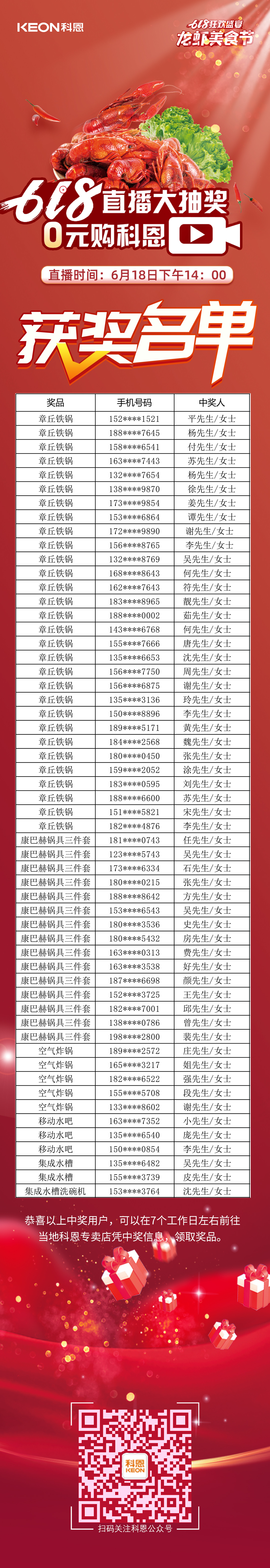萬人品美食,0元搶科恩——科恩龍蝦美食節(jié)圓滿落幕,千城千店,共襄盛舉,感謝大家對科恩集成灶的大力支持,618直播大抽獎獲獎名單火熱出爐,恭喜以上獲獎的小伙伴們,請盡快聯系當地科恩門店,快把獎品領回家吧!