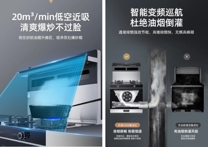 黏膩油煙是造成廚房高溫的罪魁禍?zhǔn)?,封閉廚房加上爐火的燃燒,油煙擴(kuò)散充斥著整個空間,又悶又熱,科恩S450以其低空近吸和20m3/min大吸力形成黃金攏煙區(qū),牢牢將油煙封鎖在擴(kuò)散前的升騰區(qū),吸煙距離更近,把油煙扼殺在萌芽狀態(tài),完美解決油煙難題,油煙不發(fā)散,廚房溫度自然不會高!S450搭載智能變頻巡航系統(tǒng),最大風(fēng)壓可達(dá)800Pa,高層以及做飯高峰期時,不再懼怕公共煙道油煙壓力,遇堵排煙強(qiáng)效節(jié)能,杜絕油煙倒灌,把油煙輕松排出室外,清新廚房空氣。