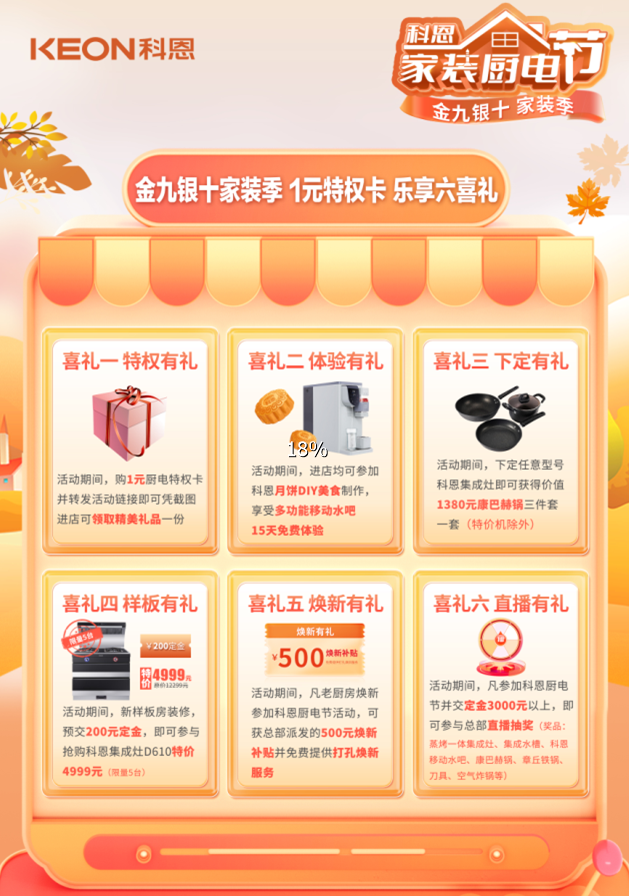 金九銀十家裝季,科恩集成灶推出科恩家裝廚電節(jié),不僅有1元家裝特權(quán)卡,0元搶廚電,提前鎖定直播抽大獎(jiǎng)名額,還能樂(lè)享六大喜禮,特權(quán)有禮、下定有禮、樣板有禮、煥新有禮、直播有禮,進(jìn)店即可參加科恩月餅DIY美食制作,還有15天移動(dòng)水吧免費(fèi)體驗(yàn),一塊錢(qián)就能買(mǎi)到的快樂(lè),怎么算都劃算!