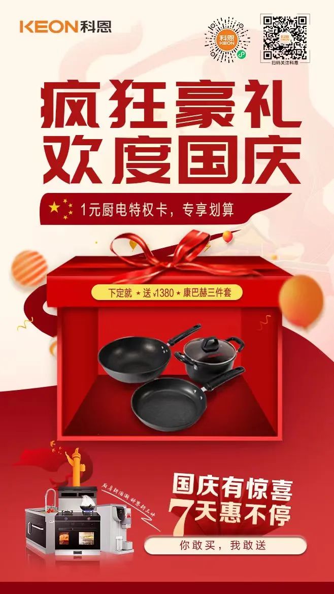 1元瘋搶?zhuān)o力國(guó)慶,科恩家裝廚電節(jié)國(guó)慶專(zhuān)輯——國(guó)慶有驚喜,7天惠不停正火熱進(jìn)行中,力度空前,更有豪華大禮包驚喜贈(zèng)送,全民鉅惠,就在科恩家裝廚電節(jié),更多鉅惠活動(dòng)請(qǐng)?jiān)斣?xún)科恩各大門(mén)店!