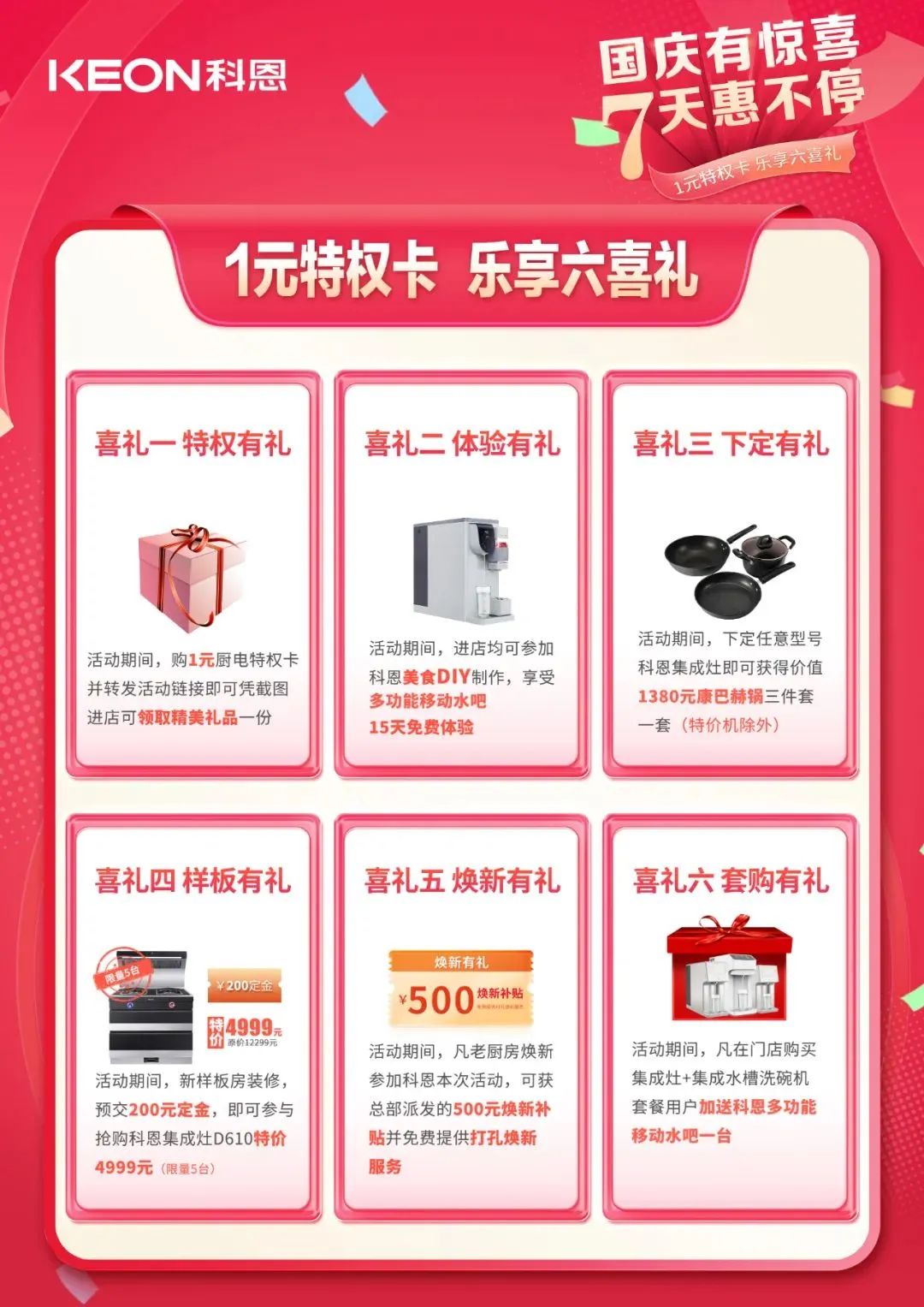 ✔ 1塊錢(qián)能干什么?在科恩集成灶,花1元即可享廚電特權(quán)卡權(quán)益,獲得驚喜禮品一份!同時(shí)還能享受科恩多功能移動(dòng)水吧15天免費(fèi)體驗(yàn)優(yōu)先使用權(quán)!