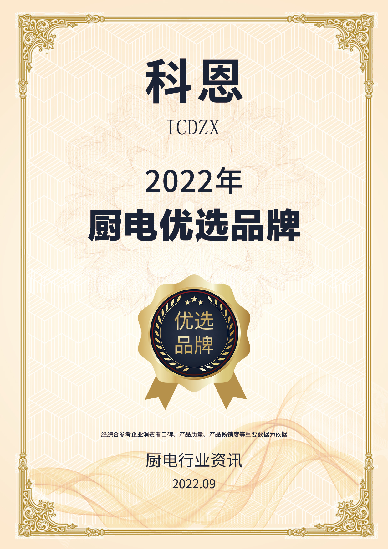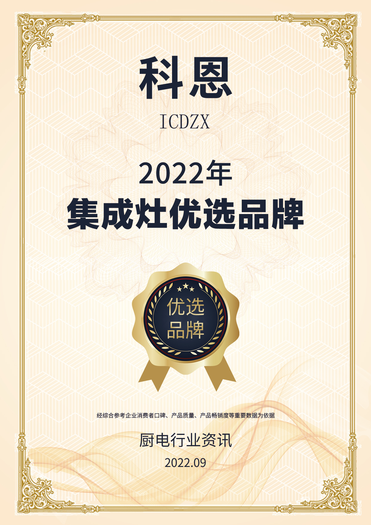 喜報(bào)!喜報(bào)!喜報(bào)!浙江科恩電器有限公司榮獲2022年度質(zhì)量月廚電行業(yè)|集成灶行業(yè)優(yōu)選品牌兩項(xiàng)殊榮!