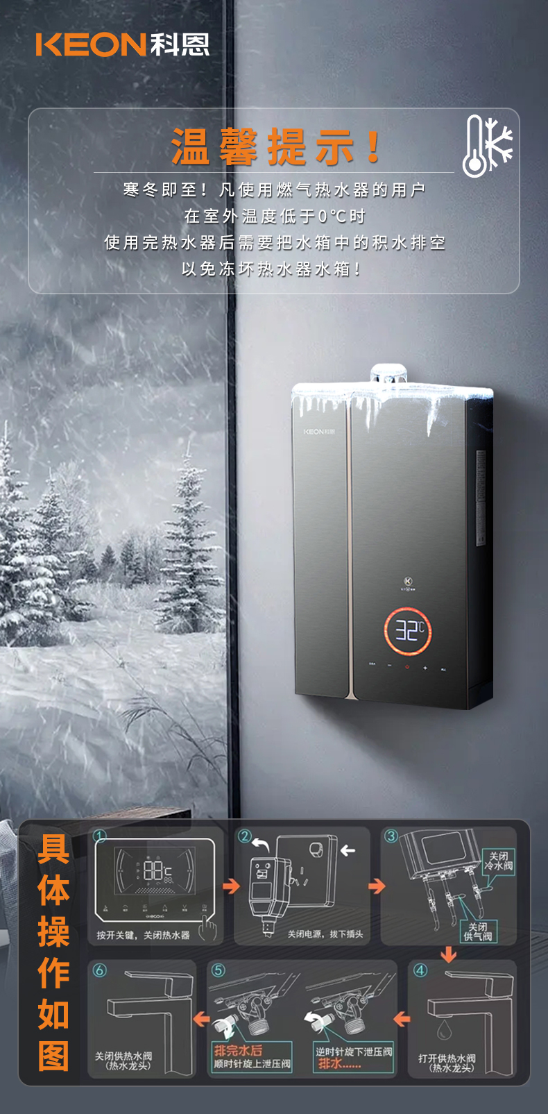 寒冬將至!當(dāng)室外溫度低于0℃時(shí),使用完熱水器后,若不及時(shí)將熱水器里的水排干凈,冷空氣變會(huì)倒灌進(jìn)熱水器內(nèi)部,水結(jié)冰后體積膨脹,容易凍壞熱水器水箱,造成不必要的麻煩和損失!因此,做好熱水器的防凍措施非常有必要!