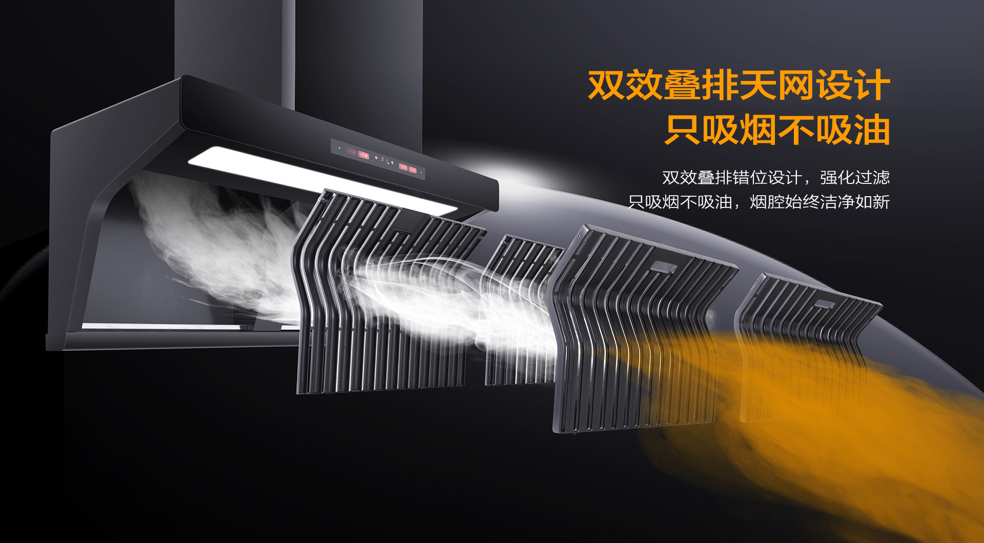 雙效疊排天網(wǎng)將油煙盡數(shù)隔離在外,真正做到只吸煙不吸油。徹底告別煙機(jī)清洗難題。煙機(jī)免拆洗,廚房更省心!