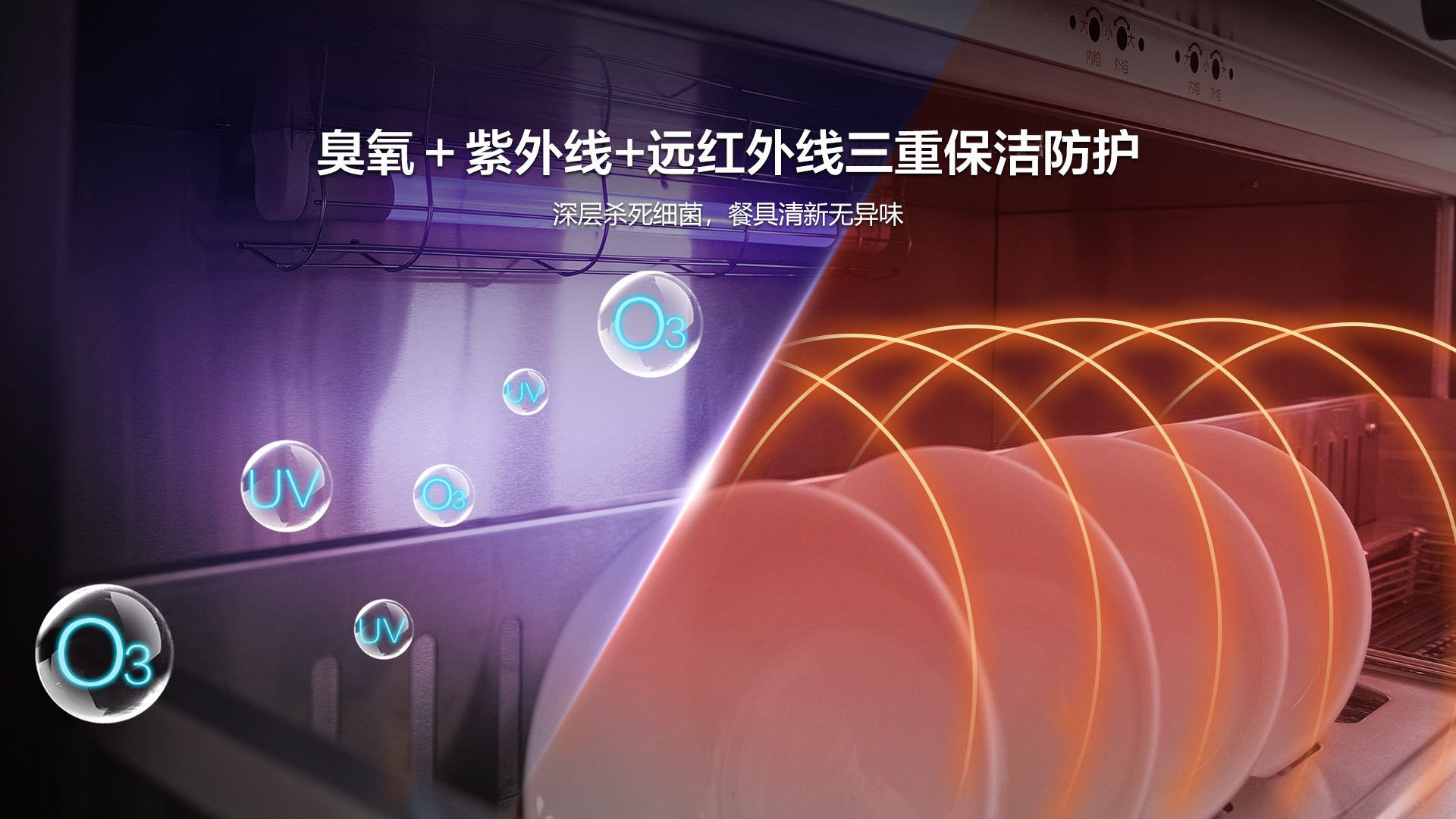 消毒柜采用臭氧+紫外線+遠紅外線三重保潔防護,深層殺死細菌,保障餐具清新無異味。