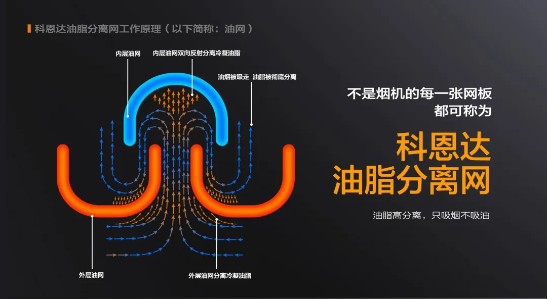 科恩達油脂分離網采用加厚太空壓鑄鋁,工藝嚴控,通過酸洗-噴砂-特氟龍噴涂-高溫燒結而成,真正易潔、易拆、耐腐、不粘油、好打理且防火阻燃,可分離96%的油脂,讓煙腔內部始終保持潔凈,很好的解決了煙機清洗難題。而整機特氟龍材質真正做到了輕打理,只需輕輕一抹,油污去無蹤。