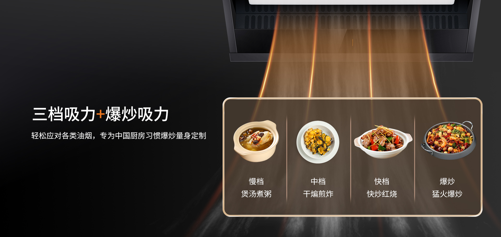 三檔吸力+爆炒吸力,輕松應(yīng)對(duì)各類油煙,專為中國廚房習(xí)慣爆炒量身定制。