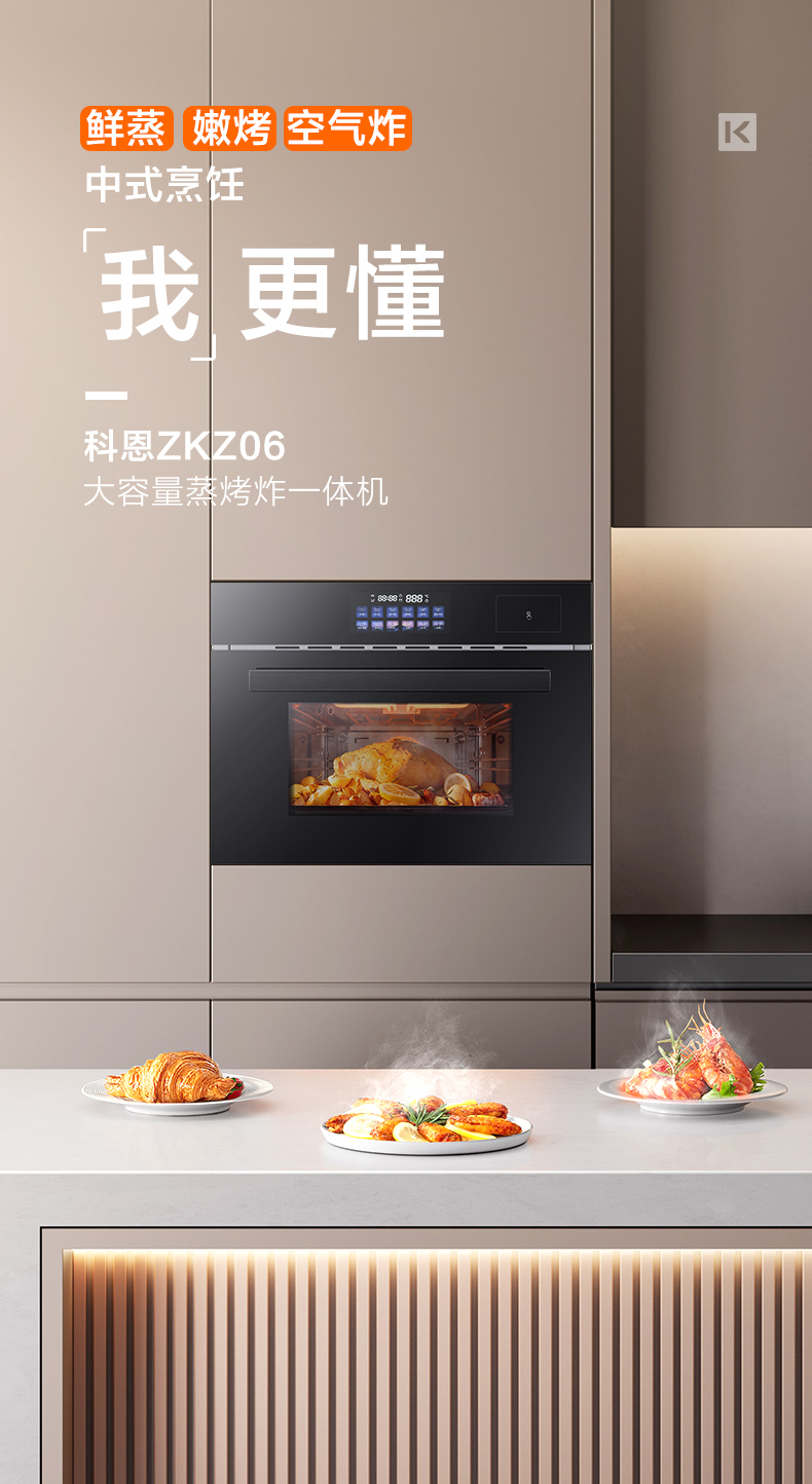科恩ZKZ06嵌入式蒸烤一體機(jī)能夠完美地融合于家居裝飾之中。隱蔽式安裝方式,使得整體廚房布局更為整潔有序,同時(shí),獨(dú)特的外觀設(shè)計(jì)既典雅大方,又具現(xiàn)代感,能為整個(gè)家居空間帶來(lái)濃厚的藝術(shù)氛圍。