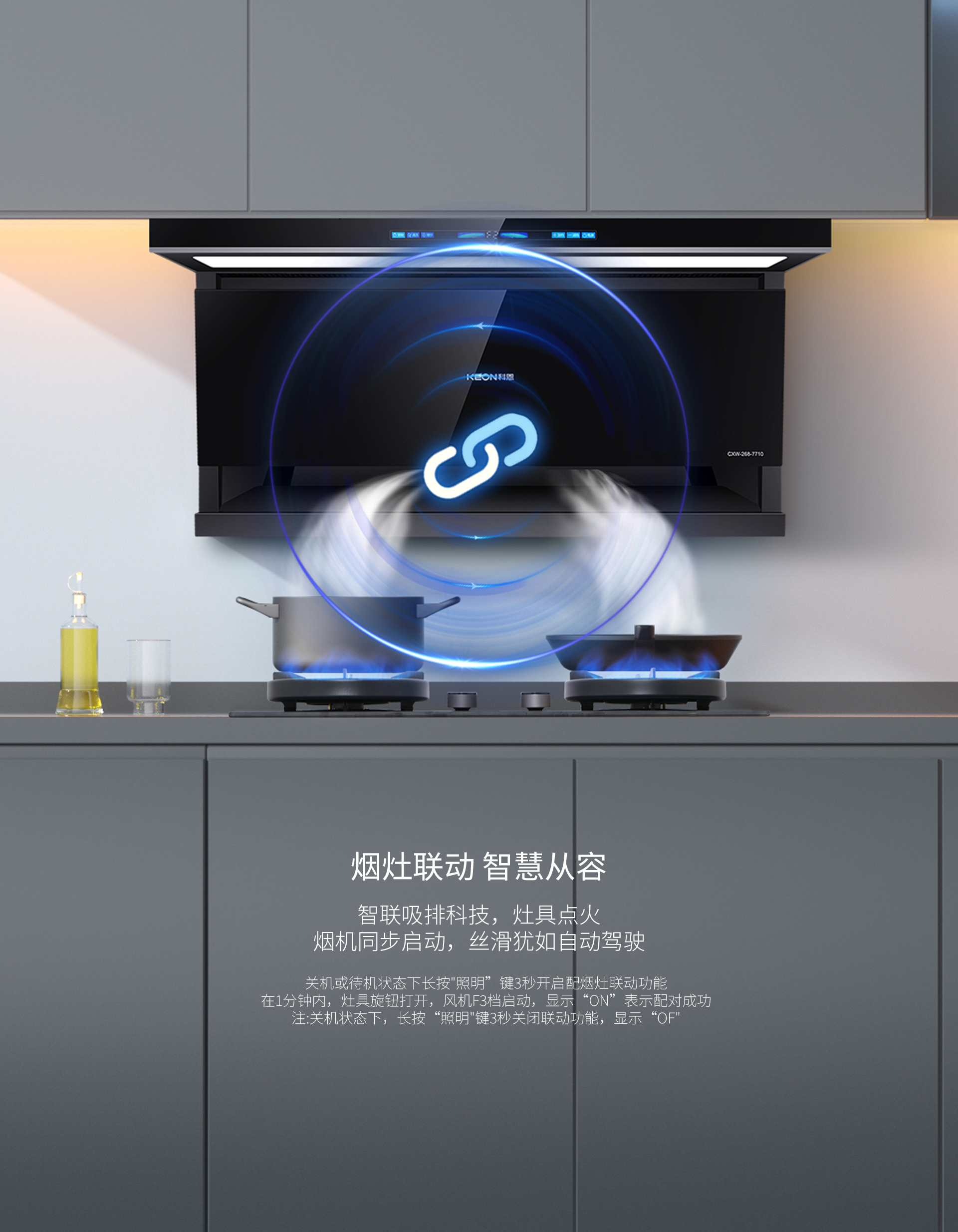 讓科恩7710智能聯(lián)動煙機(jī)走進(jìn)父母的廚房,告別油煙滋擾,用科技的力量為他們的健康保駕護(hù)航。在每一次烹飪中,讓愛與健康相伴,讓這份含蓄而深沉的親情在無煙的廚房中愈發(fā)濃郁。