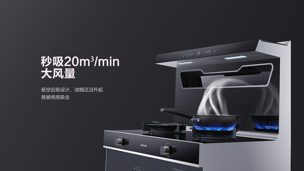 低空近吸技術(shù),緊鎖升騰油煙不上臉,吸煙快人一步,油煙無(wú)處可逃