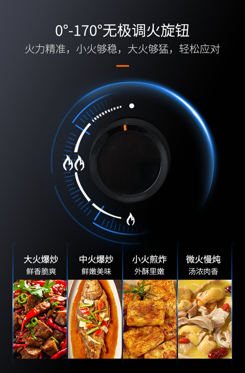 - 0°-170°無極調(diào)火旋鈕,火力大小精準控制
